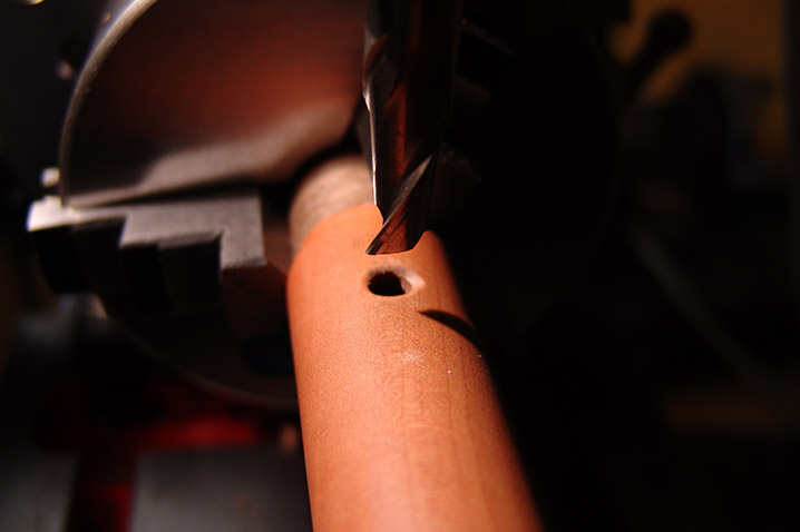 Wir fräsen den beschädigten Teil des Daumenloches aus, und setzen eine Buchse aus Kunstelfenbein, oder gegen Aufpreis auch gerne aus Horn oder Knochen, ein. Danach wird das Tonloch auf korrekte Stimmung kontrolliert und gegebenenfalls nachgearbeitet.